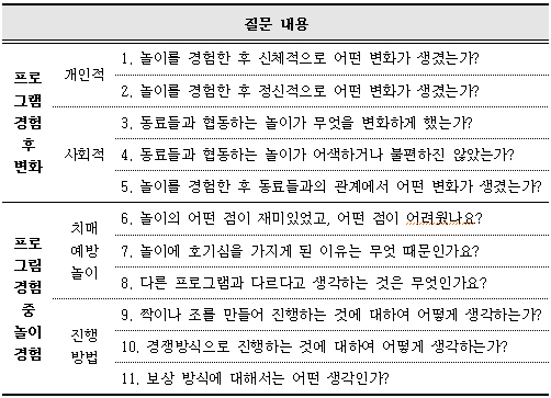 인터뷰는 총 2차례 이루어졌는데 1차 인터뷰는 1차 프로그램이 종료된 후 이루어졌고 2차 인터뷰는 2차 프로그램이 종료된 후 반 구조화된 질문지를 활용하였다. 녹음과 동시에 연구 참여자의 비언어적인 표현을 연구자만이 알아볼 수 있는 방법으로 메모지에 기록하는 일도 병행하였다.