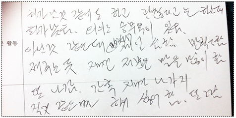 처음엔 그냥 했는데 자꾸 하다보니까 나도 모르게 이기도 싶은 생각이 들더라고, 그리고 그동안은 경쟁하는 것은 거의 없었지. 복지관에서 하는 프로그램들이야 혼자서 하는 것들이 대부분이니까. 그리고 선생님이 그렇게 분위기를 만들어 주기도 하니까. 나도 모르게 이기도 싶은 생각이 들더라고 요즘에는 그래서...하면 열심히 하지 이기려고(웃음). 늙으면 져주기도 해야 하는데 (웃음)...